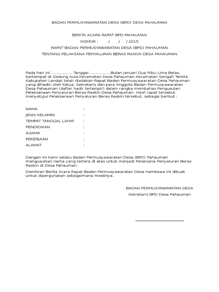 Nah untuk membantu Anda berikut akan kami sajikan contoh surat. Demikan juga dengan jabatan sebagai aparat atau perangkat desa. Demikian berita acara ini dibuat disepakati bersama dan ditandatangani oleh seluruh anggota BPD Desa Rancakole Kecamatan Arjasari Kabupaten Bandung yang hadir.